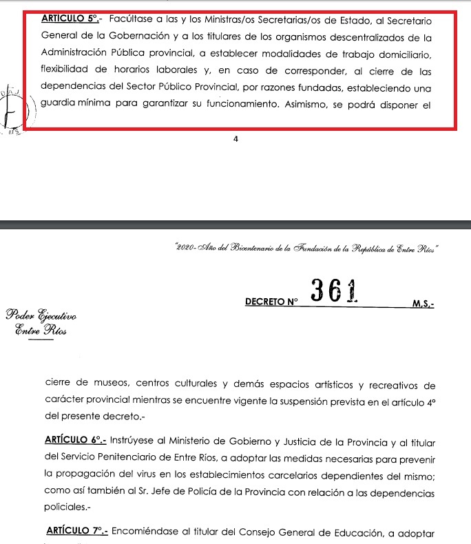 Entre sus previsiones, exclusivamente para los trabajadores del sector público, se establecía la modalidad de trabajo domiciliario, flexibilidad de horarios y cierre de las dependencias con guaridas mínimas (artículo 5 decreto 361/2020).
