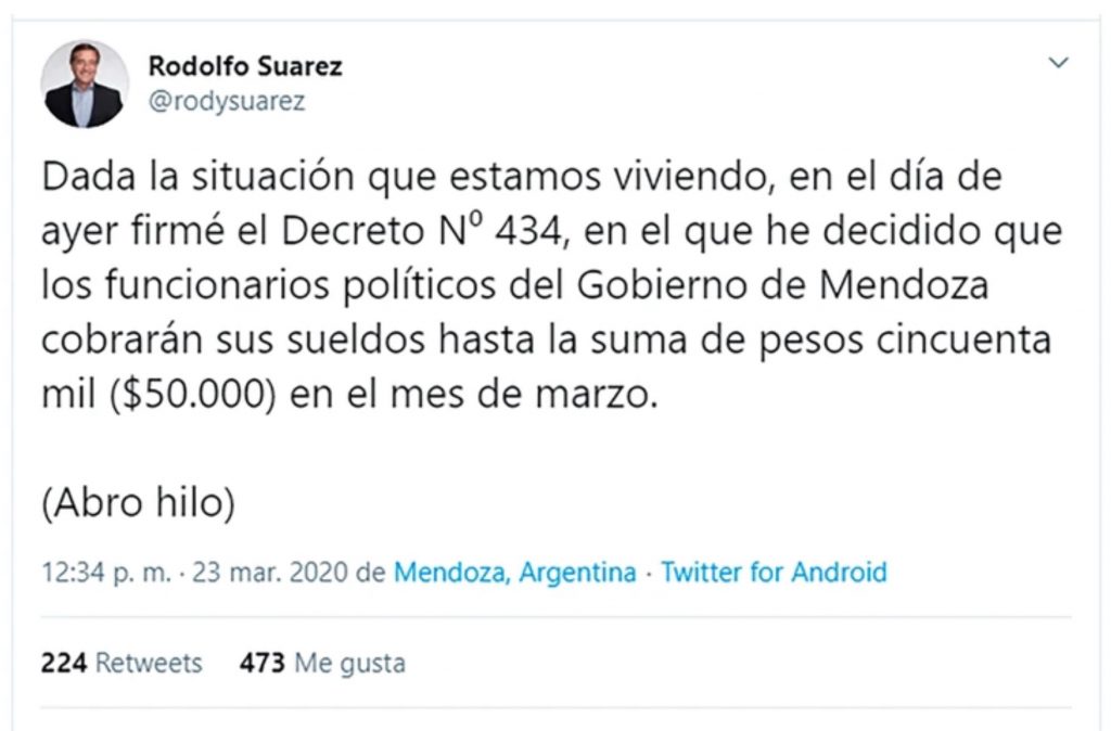 Suárez firmó, según él mismo anunció en su cuenta de Twitter, el Decreto N⁰ 434, en el que señala que los funcionarios políticos del Gobierno de Mendoza cobrarán sus sueldos hasta la suma de pesos cincuenta mil ($50.000) en el mes de marzo, con excepción de los funcionarios del Ministerio de Seguridad y de Salud.