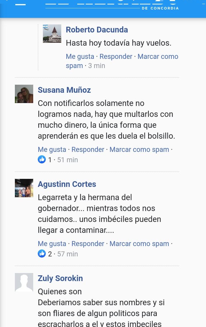 “Legarreta y la hermana del gobernador… mientras todos nos cuidamos… unos imbéciles pueden llegar a contaminar…”, escribió una usuaria de Facebook en la publicación digital del medio concordiense.