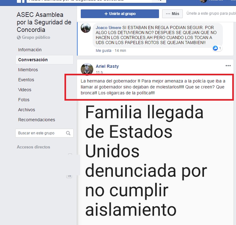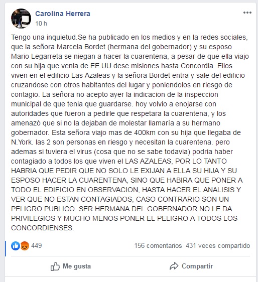 Algunos de los posteos publicados en la red social: “Tengo una inquietud. Se ha publicado en los medios y en la redes sociales, que la señora Marcela Bordet (hermana del gobernador) y su esposo Mario Legarreta se niegan a hacer la cuarentena, a pesar de que ella viajo con su hija que venia de EE.UU.dese misiones hasta Concordia. Ellos viven en el edificio Las Azaleas y la señora Bordet entra y sale del edificio cruzandose con otros habitantes del lugar y poniendolos en riesgo de contagio. La señora no acepto ayer la indicacion de la inspeccion municipal de que tenia que guardarse. hoy volvio a enojarse con autoridades que fueron a pedirle que respetara la cuarentena, y los amenazò que si no la dejaban de molestar llamaría a su hermano gobernador. Esta señora viajo mas de 400km con su hija que llegaba de N.York. las 2 son personas en riesgo y necesitan la cuarentena. pero ademas si tuviera el virus (cosa que no se sabe todavia) podria haber contagiado a todos los que viven el LAS AZALEAS, POR LO TANTO HABRIA QUE PEDIR QUE NO SOLO LE EXIJAN A ELLA SU HIJA Y SU ESPOSO HACER LA CUARENTENA, SINO QUE HABIRA QUE PONER A TODO EL EDIFICIO EN OBSERVACION, HASTA HACER EL ANALISIS Y VER QUE NO ESTAN CONTAGIADOS, CASO CONTRARIO SON UN PELIGRO PUBLICO. SER HERMANA DEL GOBERNADOR NO LE DA PRIVILEGIOS Y MUCHO MENOS PONER EL PELIGRO A TODOS LOS CONCORDIENSES”
