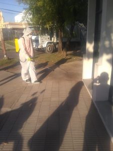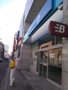 Los trabajadores desinfectaron con agua los accesos a los cajeros automáticos, a los hospitales públicos y a las clínicas privadas de la ciudad y también, en colectivos y taxis que prestan servicios.