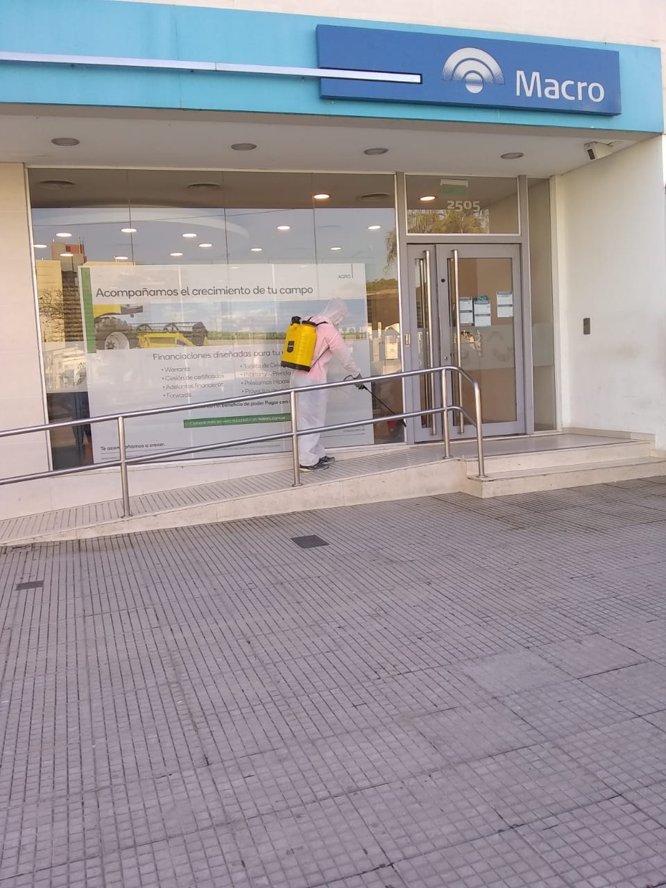 Los trabajadores desinfectaron con agua los accesos a los cajeros automáticos, a los hospitales públicos y a las clínicas privadas de la ciudad y también, en colectivos y taxis que prestan servicios.
