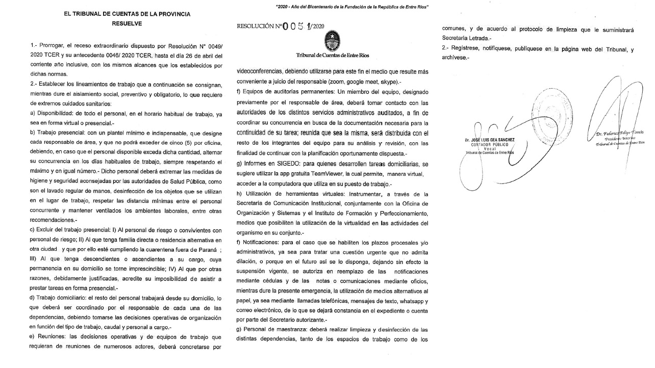 Lo que si dispusieron las autoridades por la pandemia es de ciertas indicaciones para el personal que debe asistir, entre las cuales se leen que no puede haber más de 5 personas por oficina, debiendo los mismos lavarse las manos regularmente, desinfectar objetos, respetar distancies y ventilar los ambientes.