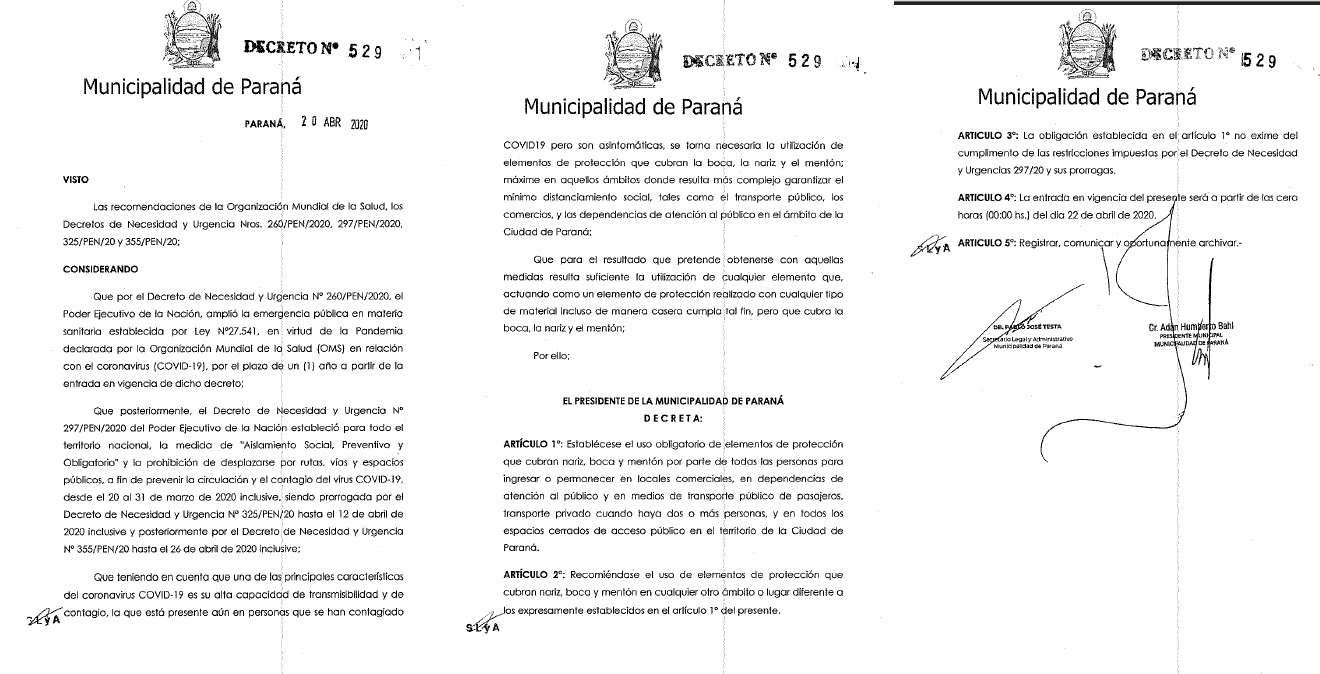 Con firma del intendente de Paraná, Adán Bahl, refrendado por el secretario legal y administrativo municipal, este martes se dispuso “el uso obligatorio de elementos de protección que cubran nariz, boca y mentón por parte de todas las personas” en la capital entrerriana.