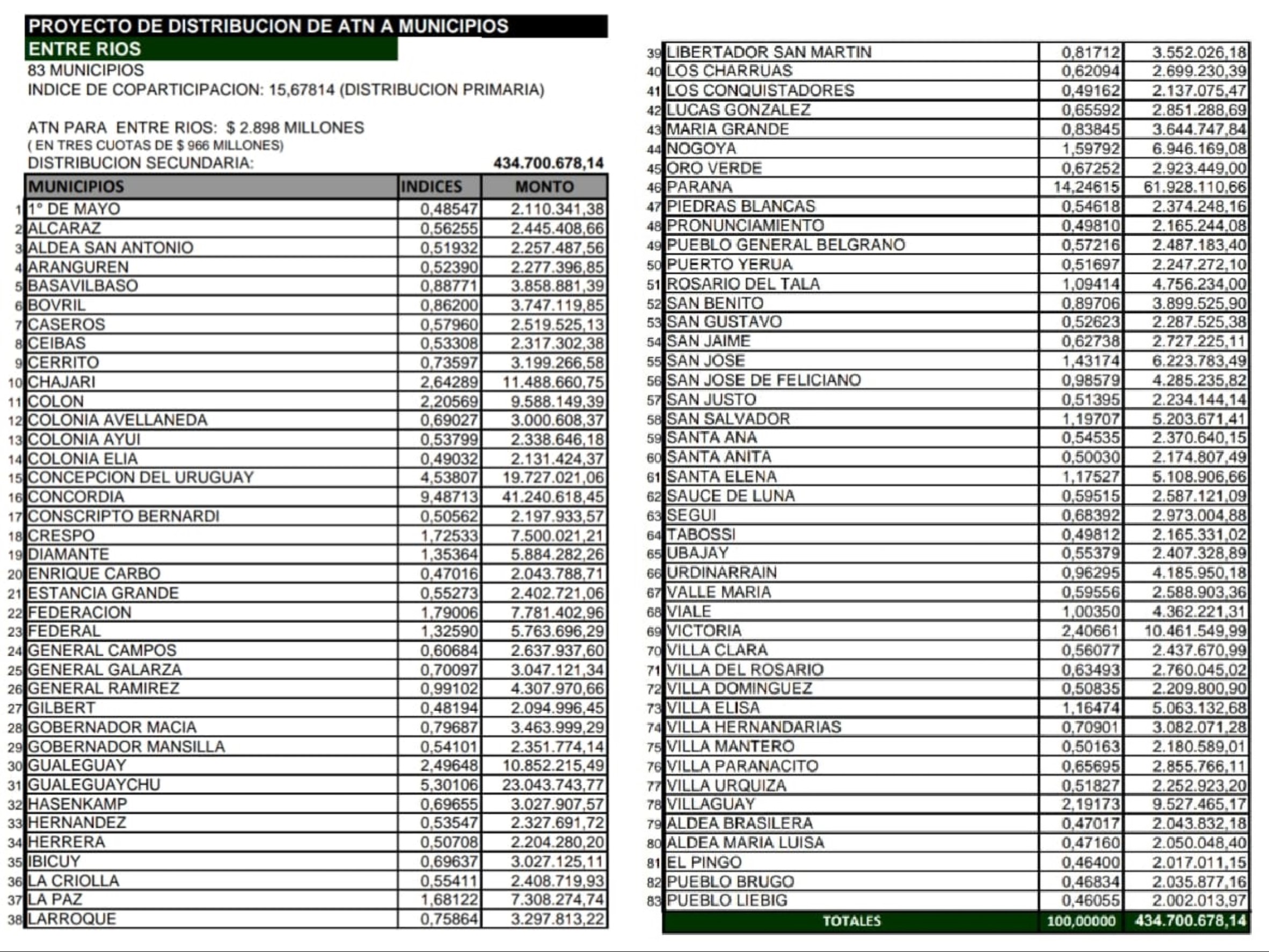 Incluso, entre los presidentes municipales de la provincia circula un cuadro en el que se detalla exactamente qué monto le correspondería a cada ciudad. Quienes perciben mayores porcentajes son Paraná y Concordia, lo que significaría 62 y 42 millones de pesos respectivamente para cada uno.