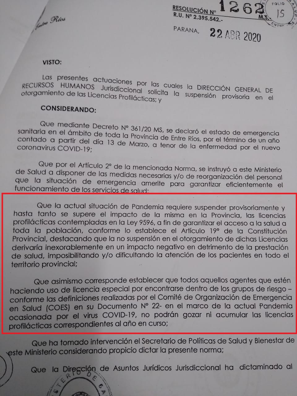 Este jueves con la firma de la ministra de salud Sonia Velázquez se estableció la suspensión de todas las licencias profilácticas en todo el territorio provincial.