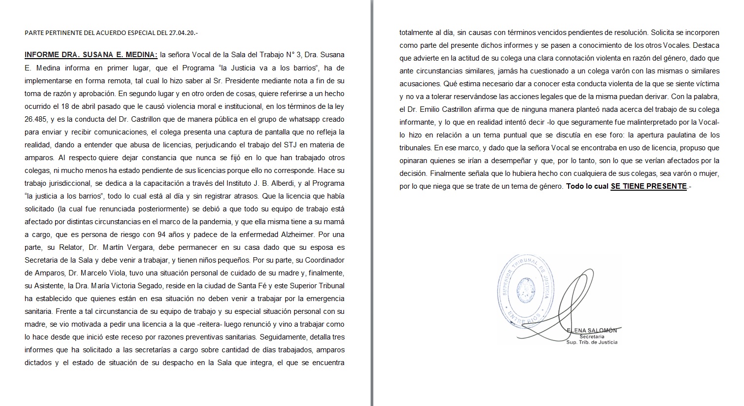 Según la magistrada, con los pedidos o reclamos de Castrillón en el grupo de whatsapp hacia la misma “…nunca se fijó en lo que han trabajado otros colegas, ni mucho menos ha estado pendiente de sus licencias porque ello no corresponde. Hace su trabajo jurisdiccional, se dedica a la capacitación a través del Instituto J. B. Alberdi, y al Programa “la justicia a los barrios”, todo lo cual está al día y sin registrar atrasos. Que la licencia que había solicitado (la cual fue renunciada posteriormente) se debió a que todo su equipo de trabajo está afectado por distintas circunstancias en el marco de la pandemia, y que ella misma tiene a su mamá a cargo, que es persona de riesgo con 94 años y padece de la enfermedad Alzheimer. Por una parte, su Relator, Dr. Martín Vergara, debe permanecer en su casa dado que su esposa es Secretaria de la Sala y debe venir a trabajar, y tienen niños pequeños. Por su parte, su Coordinador de Amparos, Dr. Marcelo Viola, tuvo una situación personal de cuidado de su madre y, finalmente, su Asistente, la Dra. María Victoria Segado, reside en la ciudad de Santa Fé y este Superior Tribunal ha establecido que quienes están en esa situación no deben venir a trabajar por la emergencia sanitaria. Frente a tal circunstancia de su equipo de trabajo y su especial situación personal con su madre, se vio motivada a pedir una licencia a la que -reitera- luego renunció y vino a trabajar como lo hace desde que inició este receso por razones preventivas sanitarias. Seguidamente, detalla tres informes que ha solicitado a las secretarías a cargo sobre cantidad de días trabajados, amparos dictados y el estado de situación de su despacho en la Sala que integra, el que se encuentra totalmente al día, sin causas con términos vencidos pendientes de resolución. Solicita se incorporen como parte del presente dichos informes y se pasen a conocimiento de los otros Vocales. Destaca que advierte en la actitud de su colega una clara connotación violenta en razón del género, dado que ante circunstancias similares, jamás ha cuestionado a un colega varón con las mismas o similares acusaciones. Qué estima necesario dar a conocer esta conducta violenta de la que se siente víctima y no va a tolerar reservándose las acciones legales que de la misma puedan derivar”.