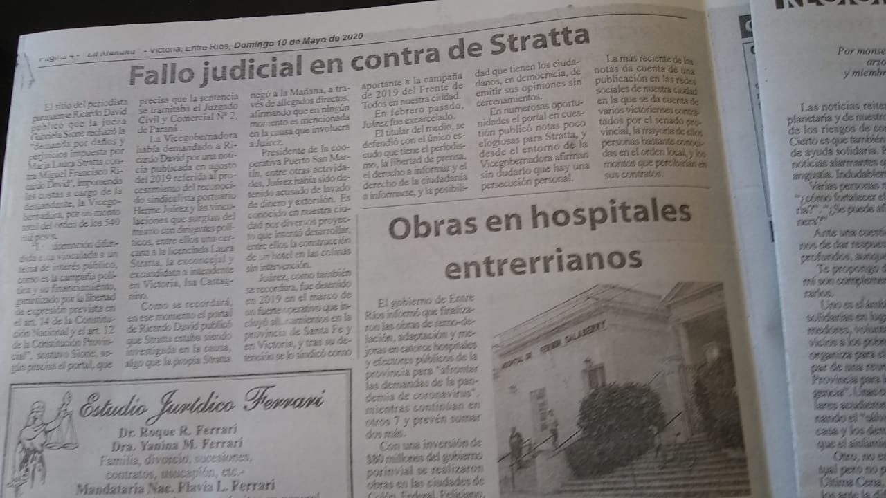 A pesar de los largos años de vida de Entre Ríos, por primera vez ocurría que una funcionaria pública, y no cualquiera, sino que la segunda persona más importante de la provincia, en aquel momento ministra de Desarrollo Social y vicegobernadora electa, Lic. María Laura Stratta, llevaba al titular de un medio a la justicia por daños y perjuicios en ejercicio de su labor.