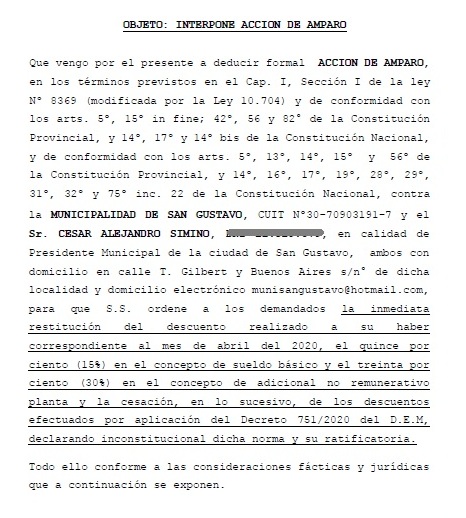 La misma fue interpuesta por un trabajador municipal de San Gustavo, contra el Municipio de su ciudad, con la novedad de que la misma también se dirige contra el intendente de la localidad, Cesar Simino.