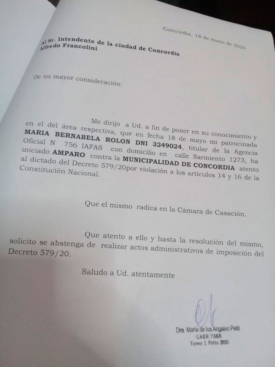 Se trata de una acción de una comerciante de la ciudad, la Sra. María Bernabela Rolon, quien, como titular de la Agencia Oficial N756 del IAFAS, plantea una vulneración de los derechos constitucionales como consecuencia del reciente 579/2020 del Ejecutivo Municipal.