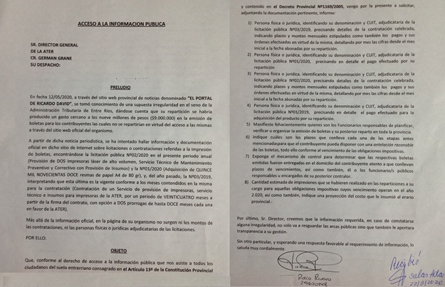 Expresamente en la nota se le solicita a Grané que informe “…1) Persona física o jurídica, identificando su denominación y CUIT, adjudicataria de la licitación pública Nº03/2019, precisando detalles de la contratación celebrada, indicando plazos y montos mensuales estipulados como también los pagos y sus órdenes efectuadas en virtud de la misma, detallando por mes las cifras desde el mes inicial a la fecha abonadas por su repartición. 2)Persona física o jurídica, identificando su denominación y CUIT, adjudicataria de la licitación pública Nº01/2020, precisando en detalle el pago efectuado por su repartición. 3)Persona física o jurídica, identificando su denominación y CUIT, adjudicataria de la licitación pública Nº02/2020, precisando detalles de la contratación celebrada, indicando plazos y montos mensuales estipulados como también los pagos y sus órdenes efectuadas en virtud de la misma, detallando por mes las cifras desde el mes inicial a la fecha abonadas por su repartición.4)Persona física o jurídica, identificando su denominación y CUIT, adjudicataria de la licitación pública Nº01/2019, precisando en detalle el pago efectuado para la adquisición del producto por su repartición. 5) Manifieste fehacientemente quienes son los Funcionarios responsables de planificar, verificar u organizar la emisión de boletas y su posterior reparto en toda la provincia. 6)Indique cuáles son los plazos que conlleva cada una de las etapas antes mencionadas para que el contribuyente pueda disponer con una antelación razonable de las boletas, todo ello conforme al vencimiento de las obligaciones impositivas. 7)Exponga el mecanismo de control para determinar que las respectivas boletas emitidas fueron entregadas en el domicilio del contribuyente atento a que conllevan plazos de vencimientos, así como también, él o los funcionario/s públicos responsables u encargados de su posterior contralor. 8) Cantidad estimada de impresiones que se hubieren realizado en las reparticiones a su cargo para aquellas obligaciones impositivas cuyos vencimiento operan en el año 2.020, así como también, indique una proyección del costo que le insumió al erario provincial”
