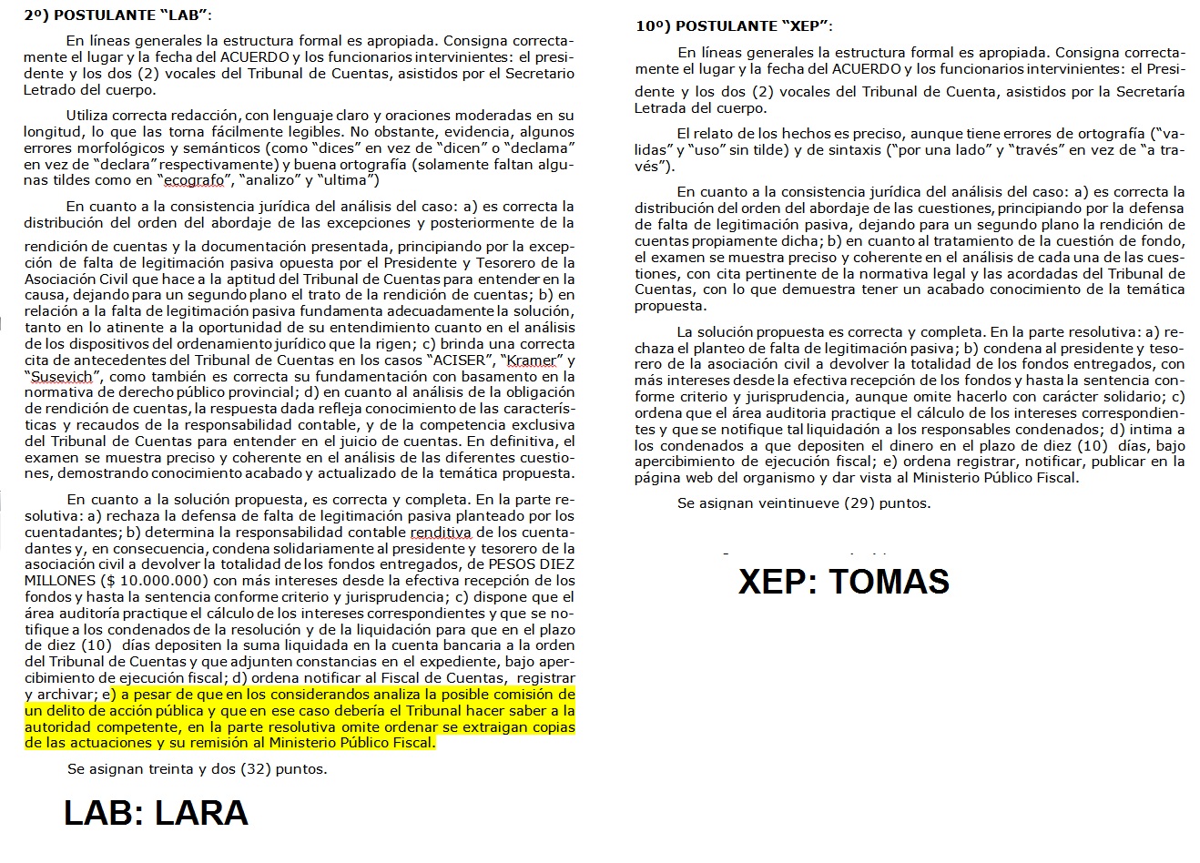 No es la única situación del examen que llamó la atención, el Portal vio el examen de Lara (Denominado postulante LAB), lo comparó con el de Tomás (XEP), Vinagre (RBV), que quedaron en la terna, como también los que quedaron eliminados, caso de Adrián Barsanti (WAD), Héctor Bergara (SUV), Juan Carlos Arralde (ZAT), Roberto Cosundino (QHA), entre otros.