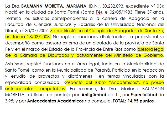 Según la información que accedió este medio, Baumann Moretta no es ni siquiera de la provincia de Entre Ríos, sino de la vecina Santa Fe, sus antecedentes académicos son nulos, así lo menciona la resolución, respecto a la especialidad su único antecedente es la participación “en la redacción y estudio de proyectos y dictámenes en temas vinculados con la especialidad concursada”, y de antigüedad en el ejercicio de la profesión, al menos en la provincia de entre ríos no registra.