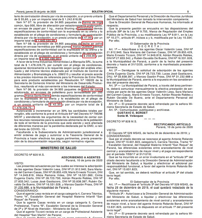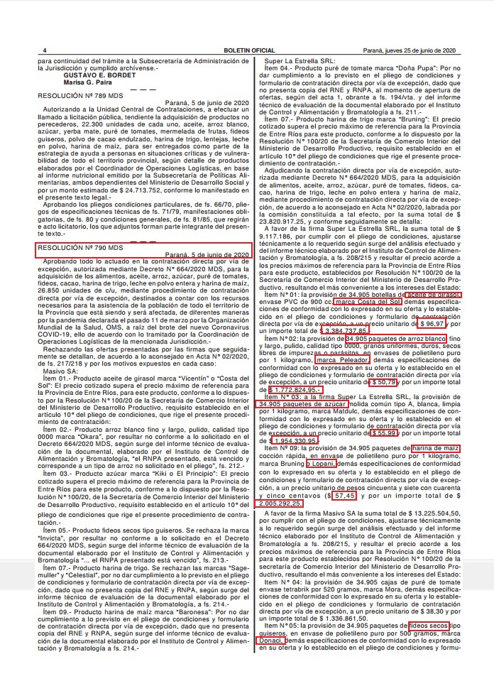 Del listado de la contratación se desprende algo más: el desconocimiento que existe sobre el resto de las marcas de los productos comprados por Paira, autorizados por Bordet, para destinar a los más vulnerables de la provincia en el contexto de pandemia.