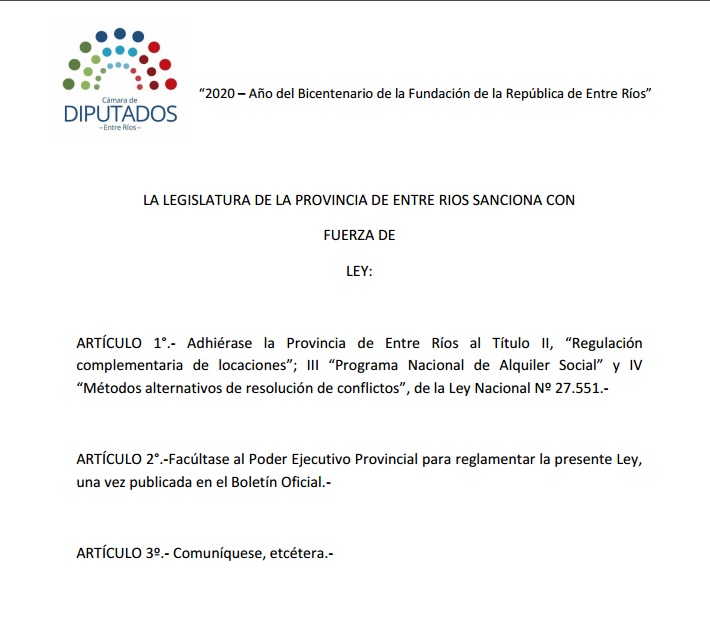 Primer iniciativa en la que propone, muy insólitamente, que la Provincia adhiera al Código Civil y Comercial de la Nación en la reforma que realizó el Congreso Nacional del capítulo de los alquileres.