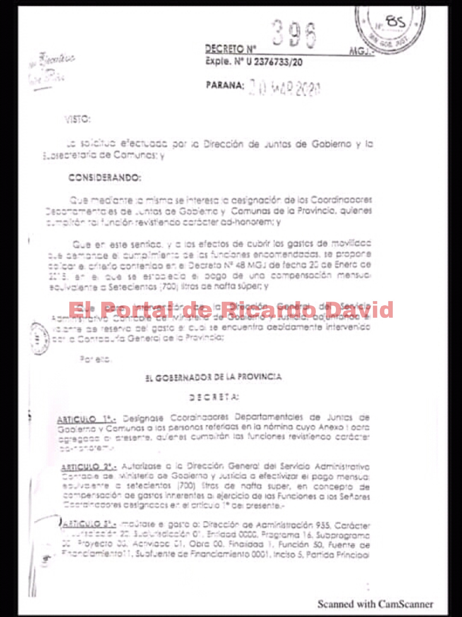 Para mostrarse «austero», estableció que los cargos eran «ad honoren», sin embargo, a continuación, en el artículo 2, dispuso que cada uno cobre mensualmente el equivalente de 700 litros de nafta super.