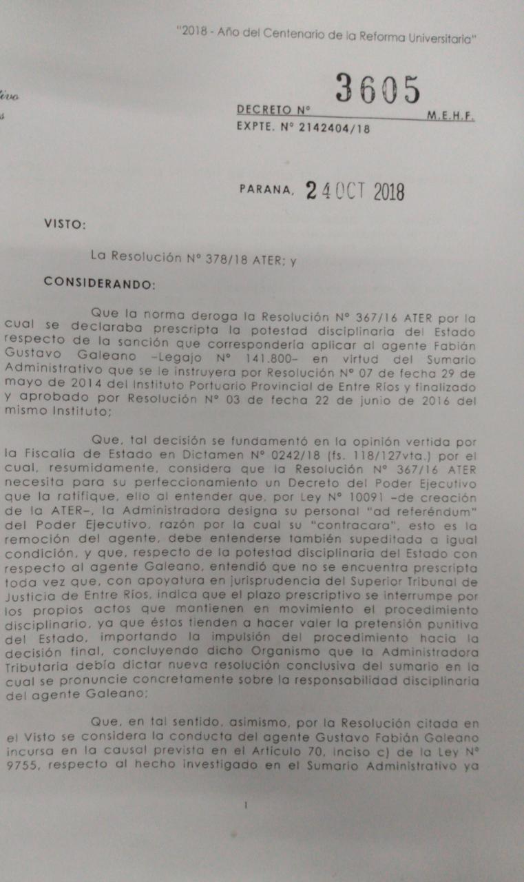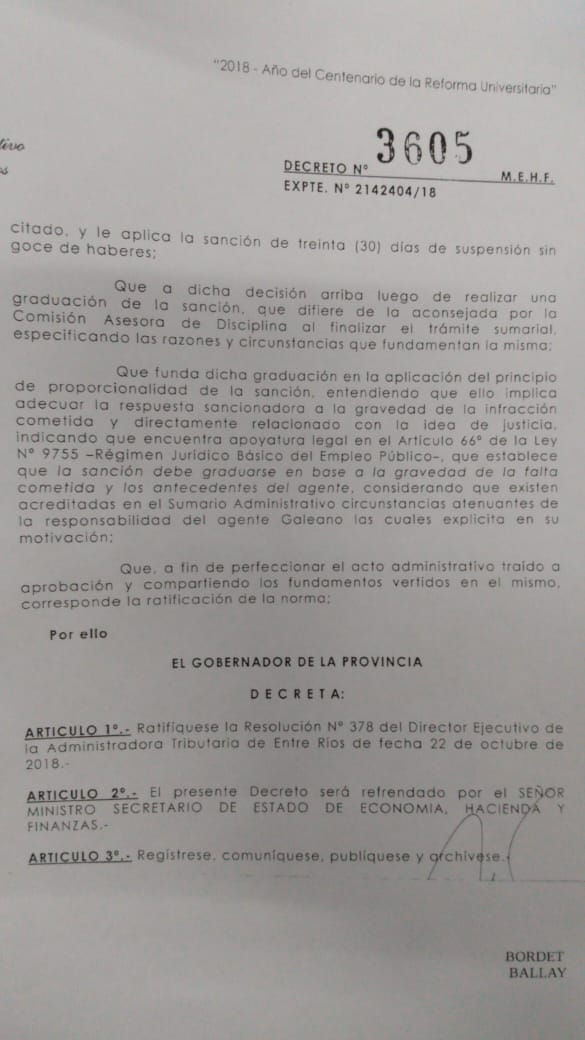 El gobernador Gustavo Bordet, mediante Decreto 3605 del 24 de octubre del2018, ratificó la resolución de Granetto, donde se le imponía la suspensión por 30 días del agente Galeano sin goce de haberes.