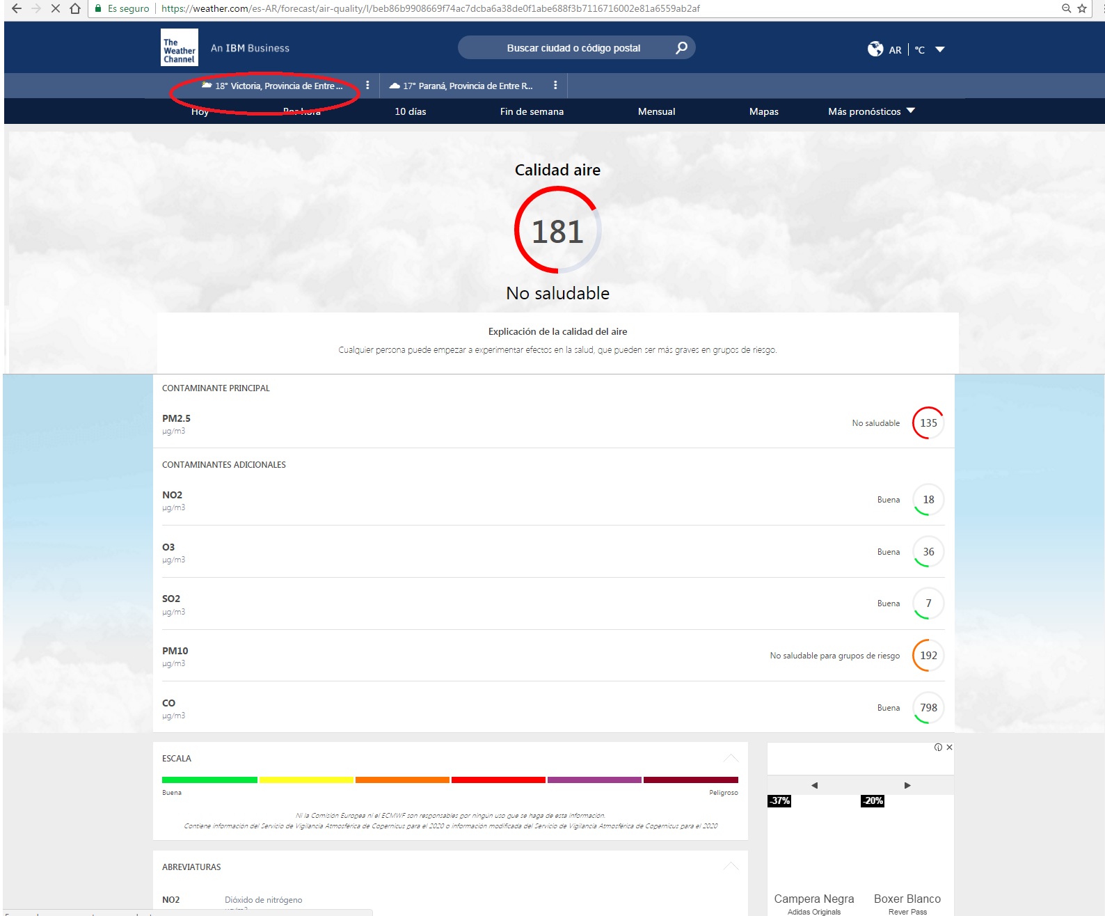 Paraná no de la única afectada, las índices en Victoria, ciudad más cercana a los incendios, son lógicamente más elevados, 181 es la cifra de la calidad del aire, notándose un nivel de PM2.5 de 112 como principal y 160 de PM 10, otro de los factores contaminantes adicionales.