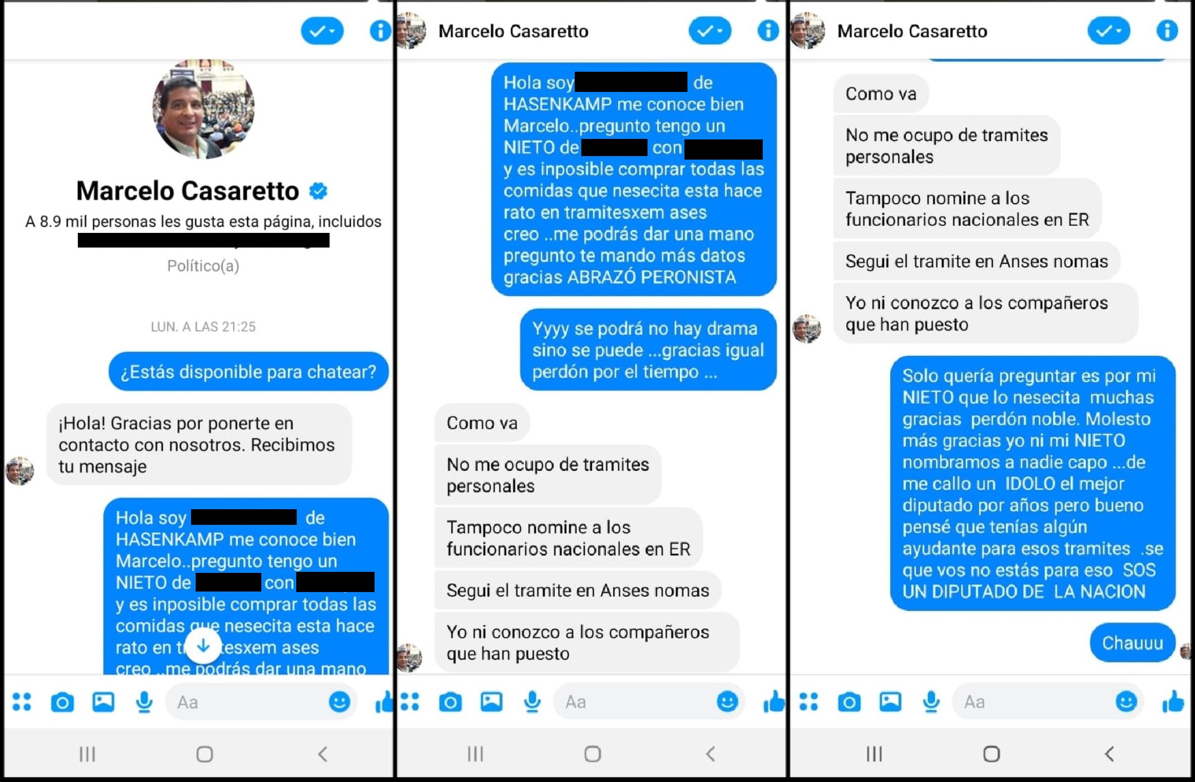 Según explica en el mensaje que puso a disposición de este Portal, un vecino militante peronista contactó al diputado con el fin de obtener ayuda en un trámite en la ANSES para su nieto, un niño menor de edad con una enfermedad sensible.