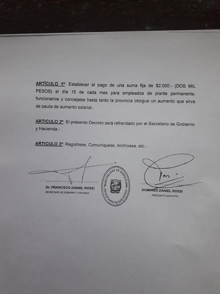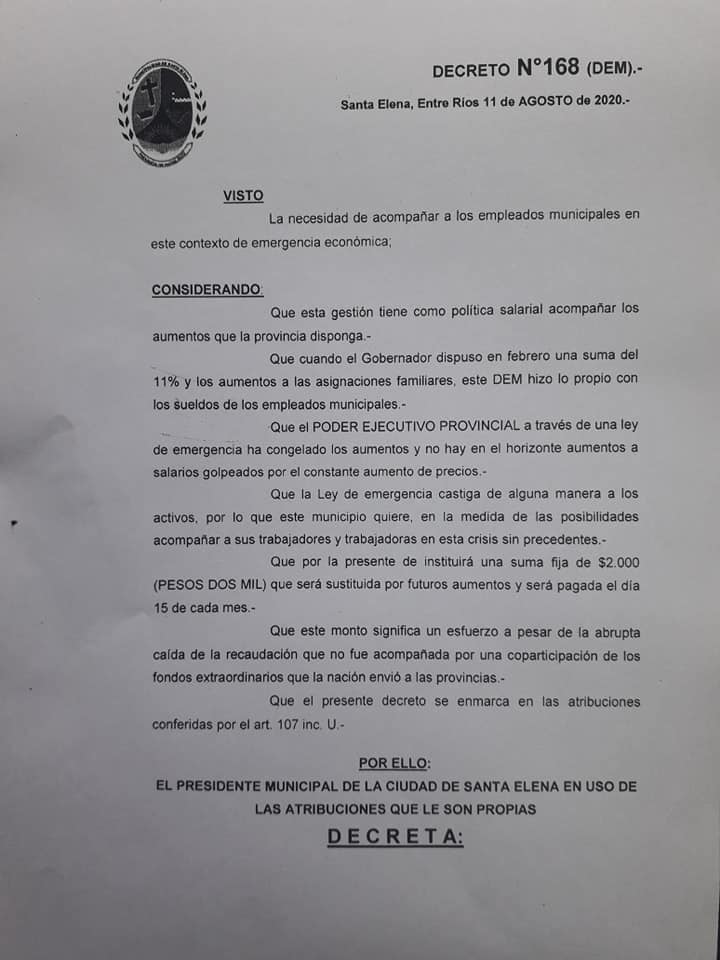 El municipio de Santa Elena otorgará a sus trabajadores una suma de dos mil pesos “que será sustituida por futuros aumentos y será pagada el día 15 de cada mes”, con el fin de “acompañar a los empleados municipales en este contexto de emergencia económica”.