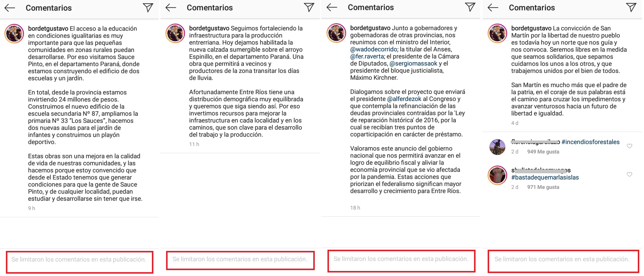 En las publicaciones subsiguientes, y en las anteriores también, el Instagram de Bordet directamente no le permite a los usuarios expresarse ni dar a conocer su opinión.