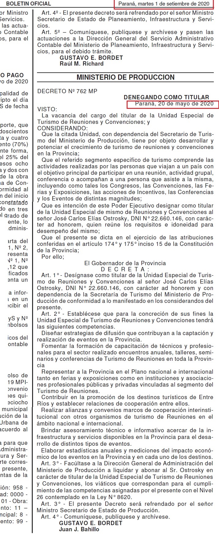 José Carlos Ostrosky fue designado, mediante decreto del gobernador Gustavo Bordet, titular de la Unidad Especial de Turismo de Reuniones y Convenciones, dependiente de la secretaría de Turismo del ministerio de Producción que conduce Juan José Bahillo.
