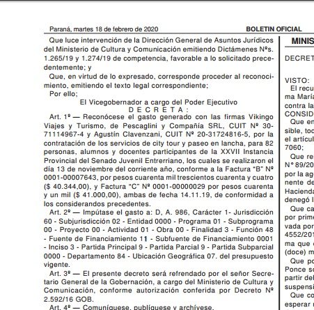 Según el decreto 3800 MCyC de fecha 28 de noviembre, el mandatario y su secretario general de la gobernación, el hoy senador nacional, Edgardo Kueider, reconocieron y pagaron la Factura “C” Nº 0001-00000029 por pesos cuarenta y un mil ($ 41.000,00), de fecha 14.11.19 a Clavenzani el servicio de «paseo en lancha para 82 personas, alumnos y docentes participantes de la XXVII Instancia Provincial del Senado Juvenil Entrerriano».