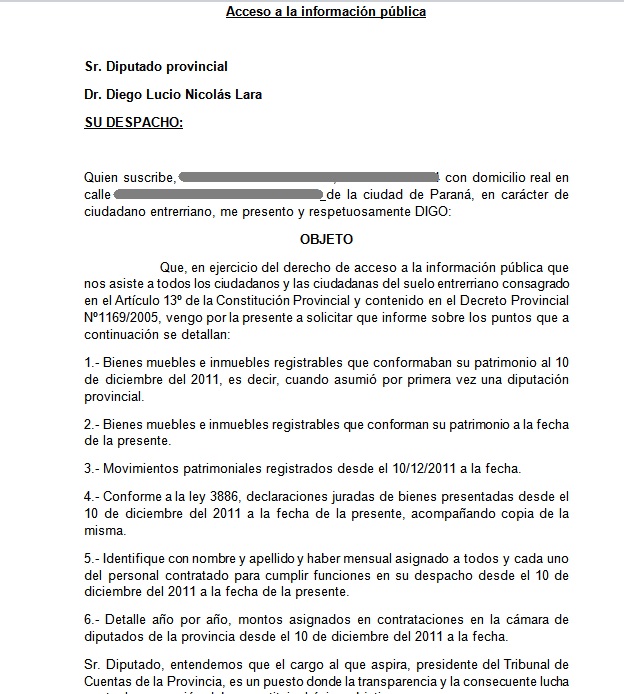 Un ciudadano de Paraná, con su escrito, busca saber puntualmente sobre el patrimonio de Lara, en todos los periodos en que estuvo sentado en la banca, como también los contratados que ha mantenido en sus años de gestión.