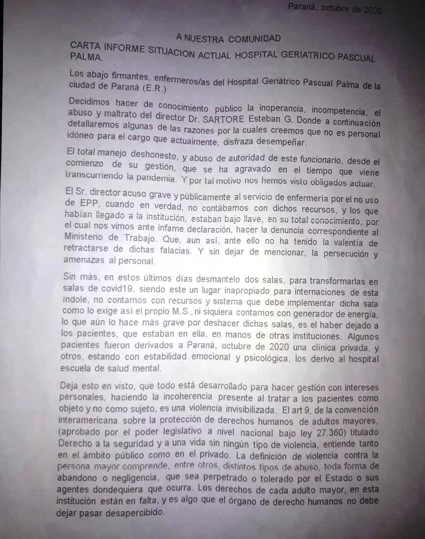 Personal de enfermería del Hospital Geriátrico Pascual Palma, de Paraná, enviaron una carta abierta a la comunidad para denunciar una grave situación que viven a raíz de los maltratos y abusos que denuncian de parte del director del nosocomio, el doctor Esteban Sartore.