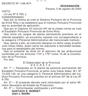 En el Boletín Oficial del pasado 28 de octubre se publicó y oficializó el nombramiento de Julio César Aldaz como personal de planta permanente del Instituto Portuario de Entre Ríos.