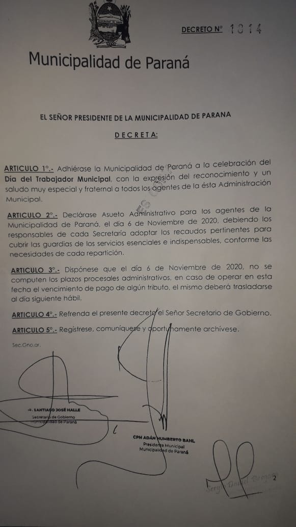 Mediante el decreto Nº 1814, el intendente declara asueto administrativo para los agentes de la municipalidad de Paraná, el día viernes 6 de noviembre, previendo que no se computen los plazos procesales administrativos, y previendo que si en esta fecha opera algún vencimiento de tributo municipal, el vencimiento se traslade al día siguiente hábil.