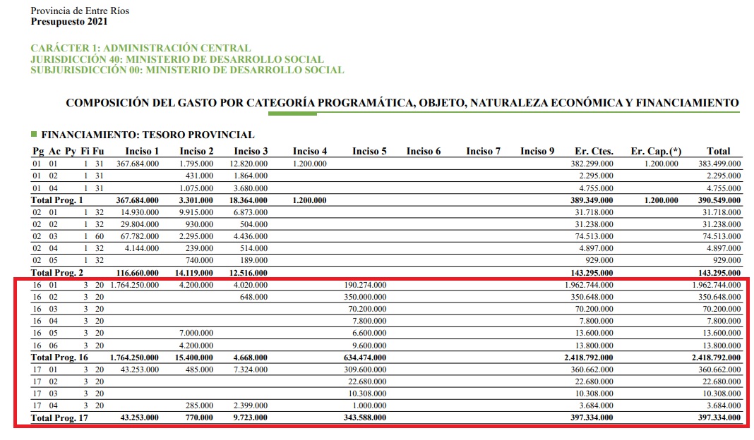 En este nuevo presupuesto, los fondos destinados a estos programas, que dependen del ministerio de Desarrollo Social que conduce Marisa Paira, llegan a 2.418.792.000.