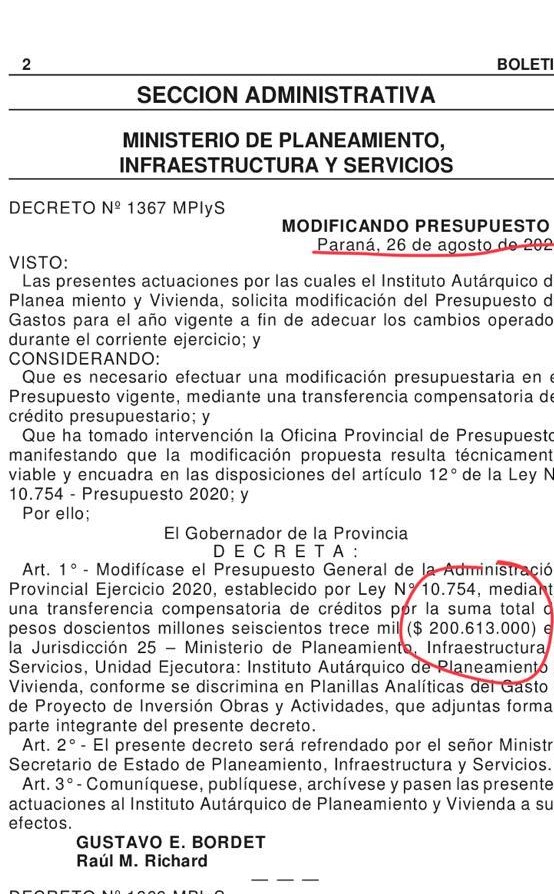 Sin embargo, con fecha del 26 de agosto de este año, el gobernador Gustavo Bordet y el ministro de Planeamiento, Marcelo Richard, firmaron el decreto 1367, que otorga la modificación presupuestaria.