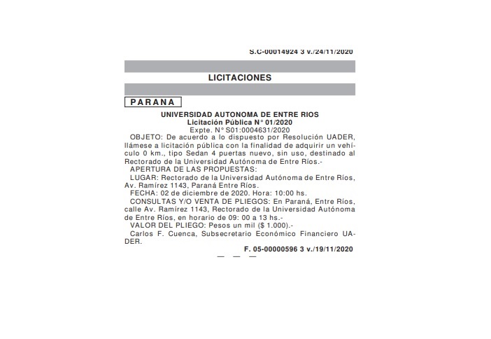 La Universidad Autónoma de Entre Ríos llamó a licitación para la adquisición de un vehículo cero kilómetro.