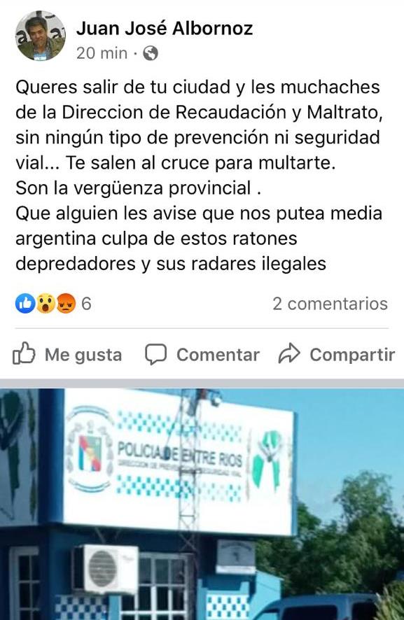 El ex diputado provincial Juan José Albornoz hizo un duro descargo en las redes sociales, en donde se despachó duramente contra los controles ejercidos en las rutas entrerrianas por la policía de Entre Ríos.