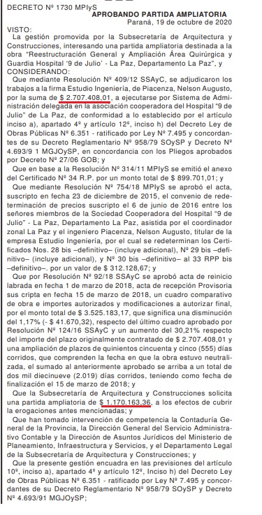 Para la obra de “Reestructuración General y Ampliación Área Quirúrgica y Guardia Hospital 9 de Julio”, de la ciudad de La Paz, el gobierno provincial realizará una inversión de 3.800.000 pesos.