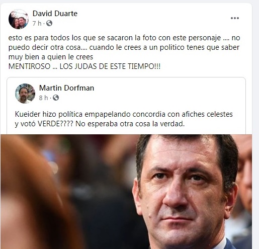 Otro usuario de las redes directamente lo trató de “mentiroso” y “judas”, mientras que otro afirmó “Kueider hizo política empapelando Concordia con afiches celestes y votó VERDE????”.