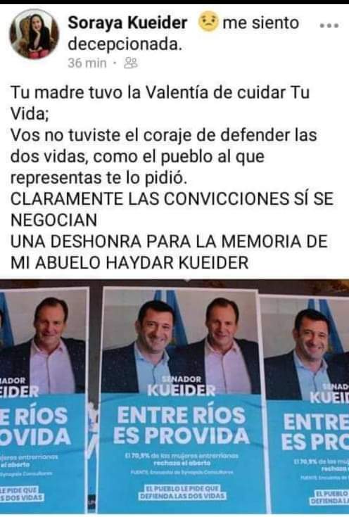 Entre otros, una persona llamada Soraya Kueider afirmó sentirse decepcionada y publicó una foto en la que se ve al legislador junto con el gobernador Gustavo Bordet, con el pedido de los sectores contrarios al aborto para que rechazara la normativa.