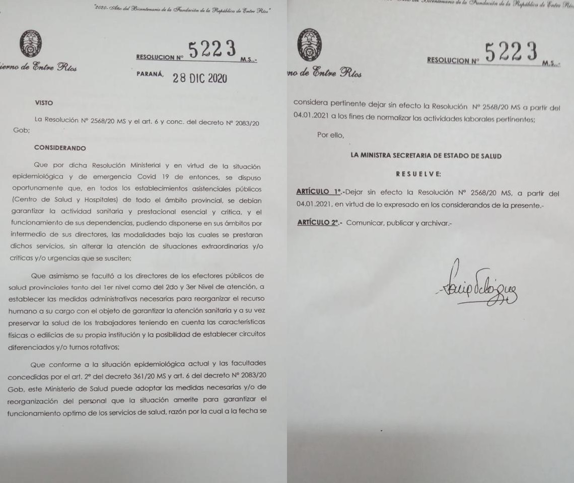 Hoy, por la resolución 5223 del ministerio de Salud, que lleva la firma de la ministra Sonia Velázquez, todos los trabajadores del sistema sanitario deben retomar sus labores de forma habitual, más allá de pertenecer o no a grupos de riesgo y demás.