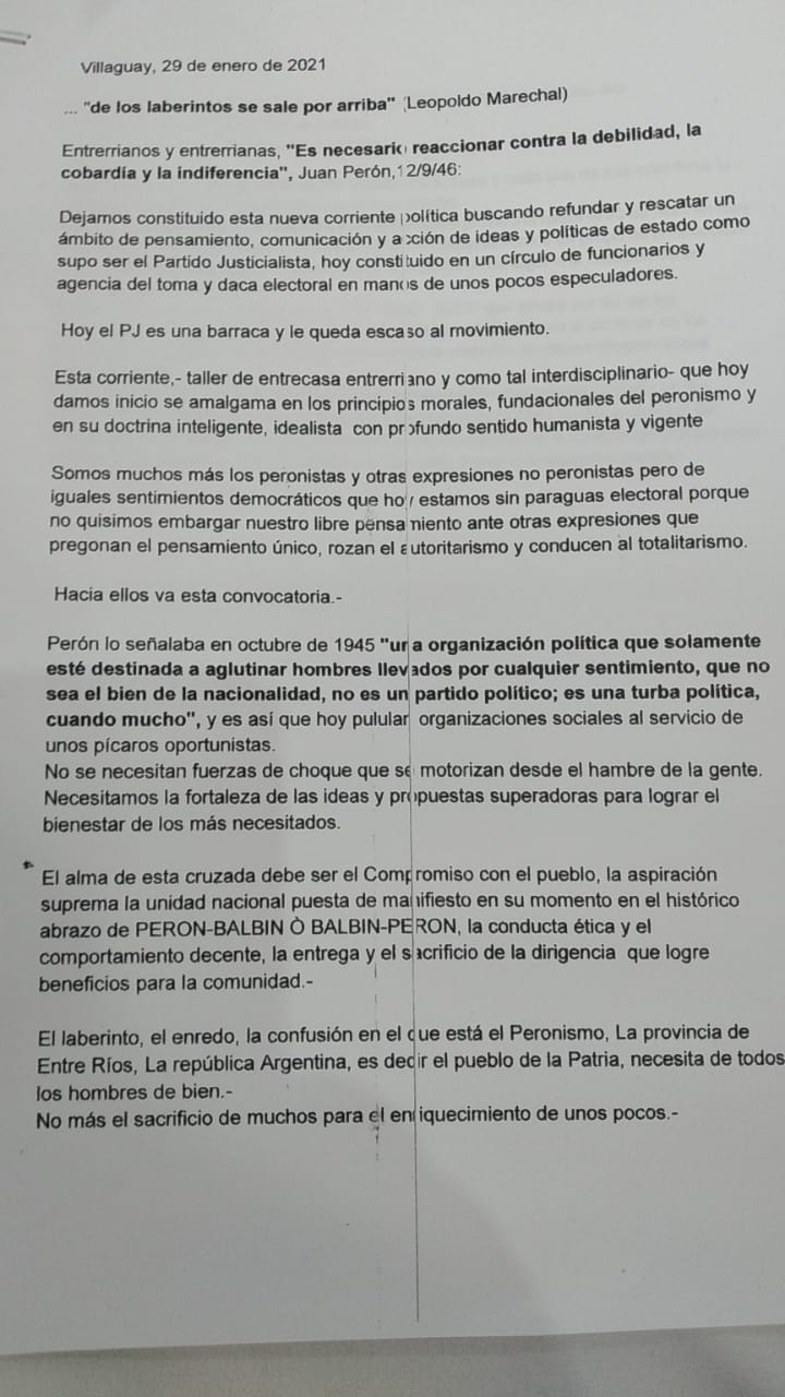 Si bien está conformado por dirigentes de raíz peronista, la lista se presentará por fuera de la estructura oficial del justicialismo, y se lanza con un documento muy crítico hacia el oficialismo provincial.