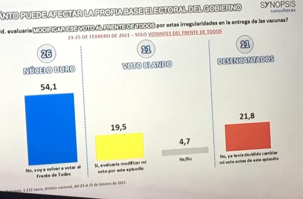 La consultora entrevistó a personas que votaron al Frente de Todos en las últimas elecciones para saber si modificarían su voto por las irregularidades en torno a la vacunación contra el coronavirus.
