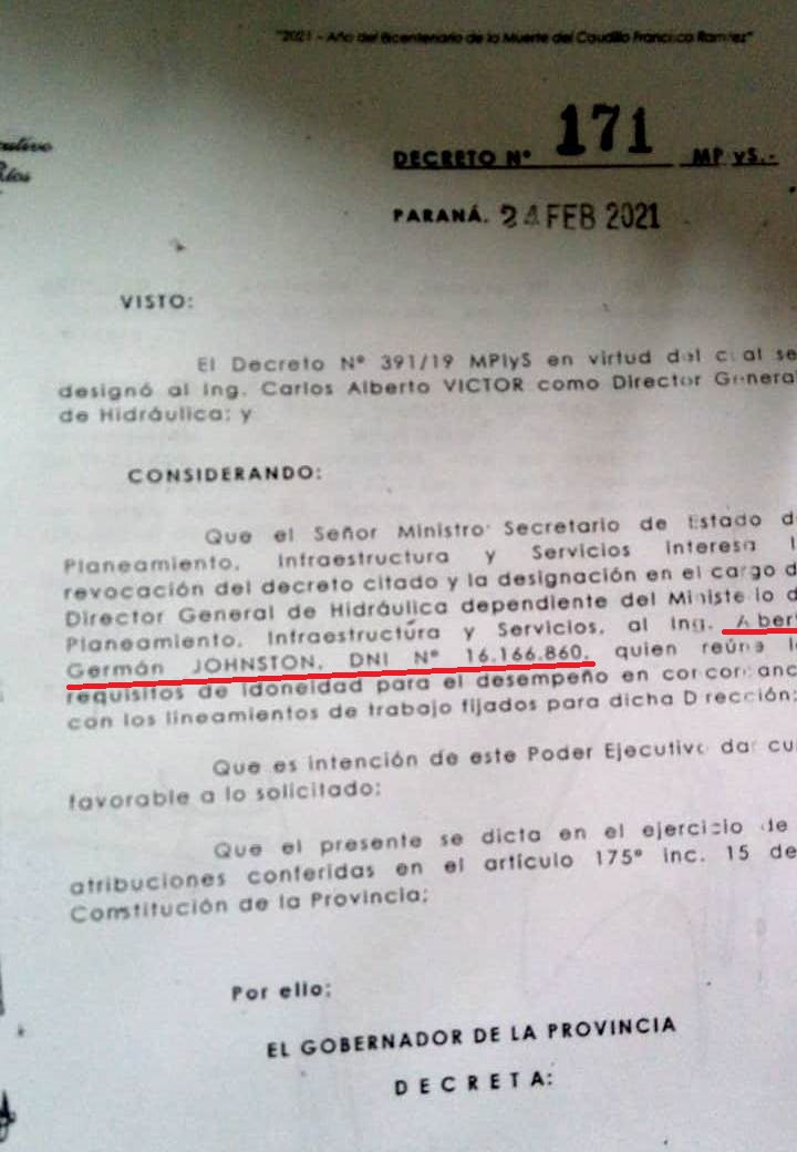 El gobernador de la provincia, Gustavo Bordet, firmó este 24 de febrero el decreto N° 171 del ministerio de Planeamiento, que conduce Marcelo Richard, para la designación del ingeniero Alberto Johnston en la dirección General de Hidráulica de la provincia.