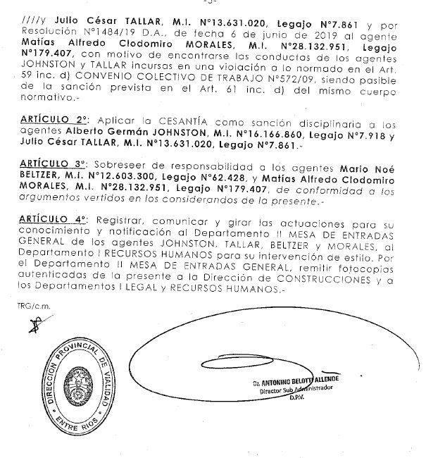 Según la instrucción realizada, el accionar de Johnston en la certificación de la obra constituía “un perjuicio material a la repartición”, que se encuadraba en las causales para aplicar la sanción de cesantía.