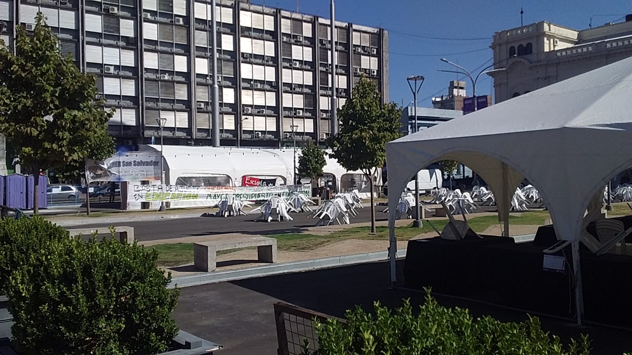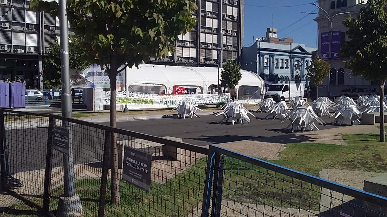 A metros de donde se instalaron los gazebos y mesas que servirán de stands para la feria, se ubica la carpa que los docentes armaron para reclamar por mejoras salariales.