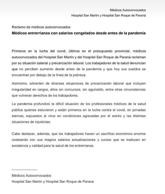 Médicos autoconvocados del Hospital San Martín y del San Roque de Paraná emitieron un duro comunicado contra el gobierno provincial en el que reclaman por mejores condiciones laborales y salariales.