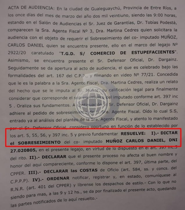 En tanto se le dictó la inocencia al Sargento 1° Carlos Daniel Muñoz este 11 de Marzo del 2021.