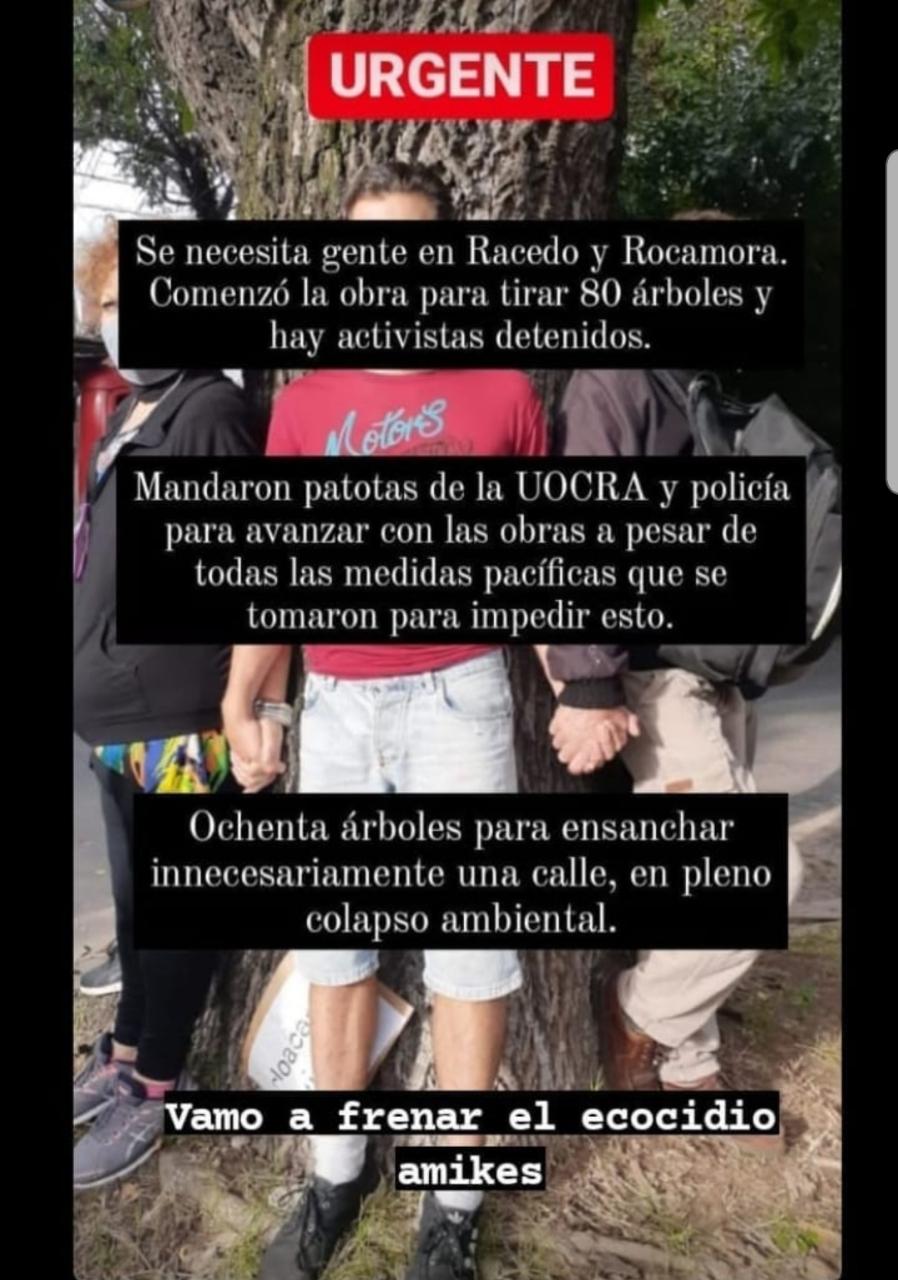 Remarcaron que “hay activistas detenidos” y argumentan que se talarán “80 árboles para ensanchar innecesariamente una calle, en pleno colapso ambiental”.