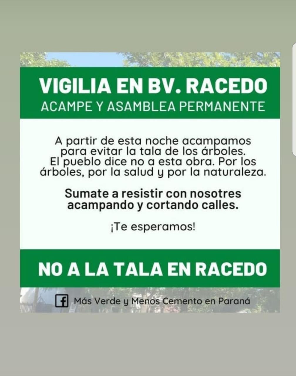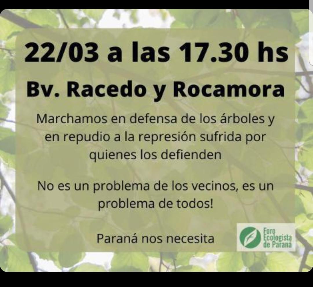 El foro ecologista, a quien la Justicia entrerriana rechazó los reclamos por vías judiciales, convoca una marcha para este lunes a partir de las 17.30, que comenzará en Bulevar Racedo y Rocamora, «en defensa de los árboles y en repudio a la represión sufrida por quienes los defienden».