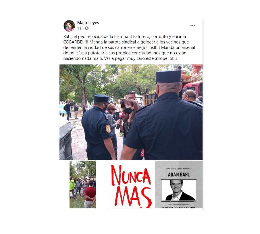 “Bahl, el peor ecocida de la historia!!!” comienza la publicación. “Patotero, corrupto y encima COBARDE!!! Manda la patota sindical a golpear a los vecinos que defienden la ciudad de tus carroñeros negocios!!!!!” continúa.