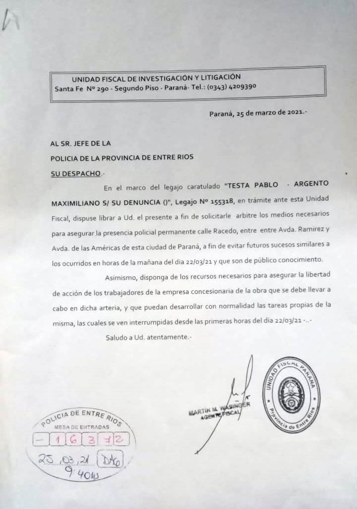 En ese sentido, la nota solicita “disponga de los recursos necesarios para asegurar la libertad de acción de los trabajadores de la empresa concesionaria de la obra que se debe llevar a cabo en dicha arteria, y que puedan desarrollar con normalidad las tareas propias de la misma”.